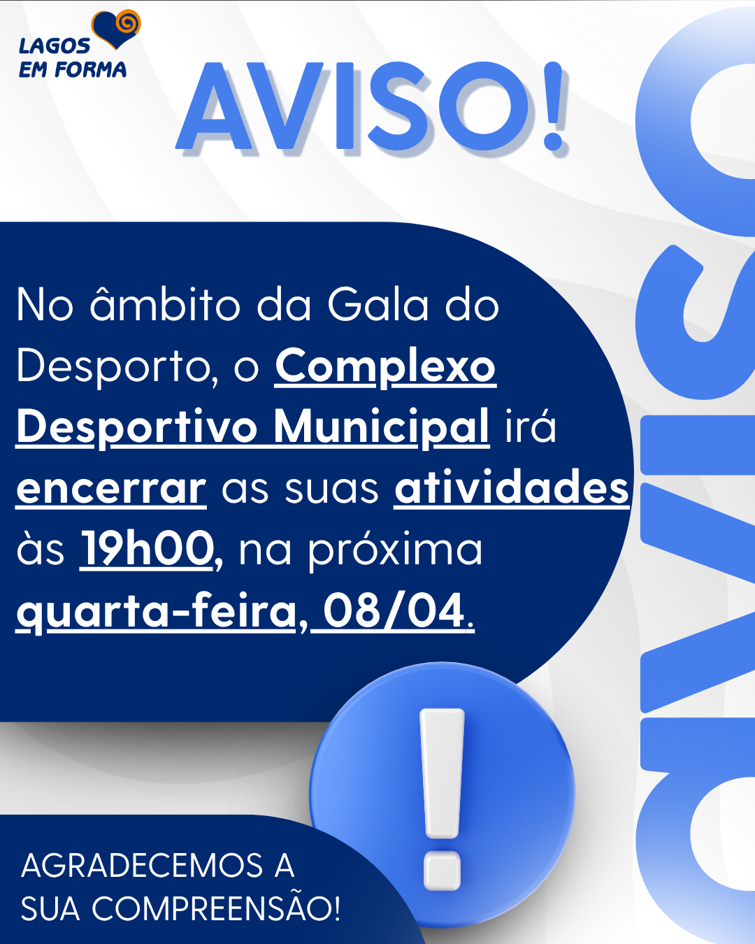 Informamos que, no âmbito da Gala do Desporto, o Complexo Desportivo Municipal irá encerrar as suas atividades mais cedo na próxima quarta-feira, dia 08 de abril, às 19h00.