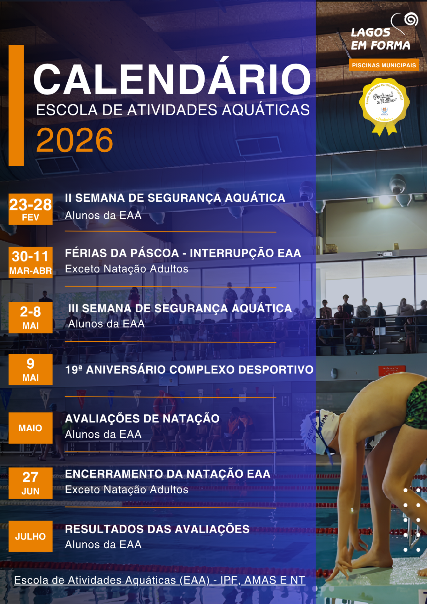 Consulte as principais datas do ano letivo da Escola de Atividades Aquáticas, incluindo as Semanas de Segurança Aquática, a interrupção na Páscoa, as avaliações de natação, o aniversário do Complexo Desportivo e o encerramento das atividades. Todas as informações essenciais da época 2026 reunidas num só local.