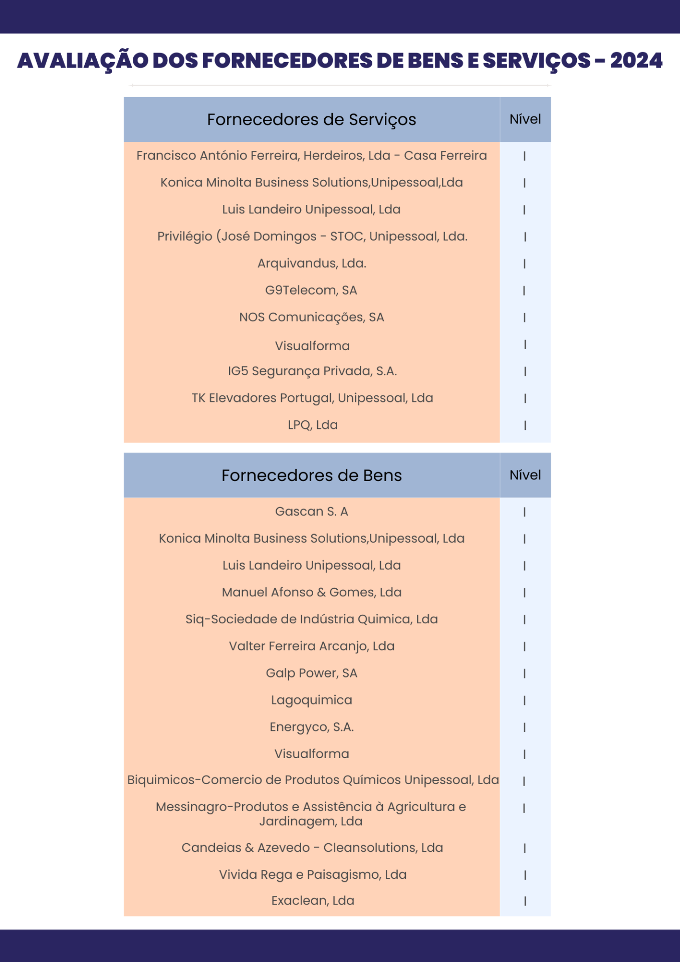 Tendo em vista este processo de avaliação, a Lagos Em Forma, Gestão Desportiva E.M. SA disponibiliza os resultados da avaliação final de fornecedores de bens e serviços na página web https://www.lagosemforma.pt/politica-da-qualidade