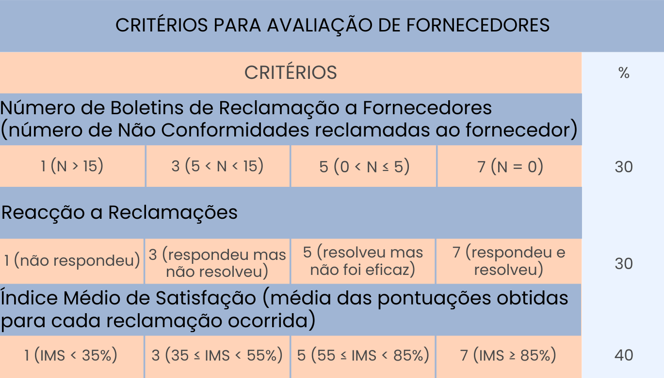 De acordo com a nota atribuída nos itens acima mencionados, é realizada a classificação dos fornecedores, conforme a tabela seguinte: