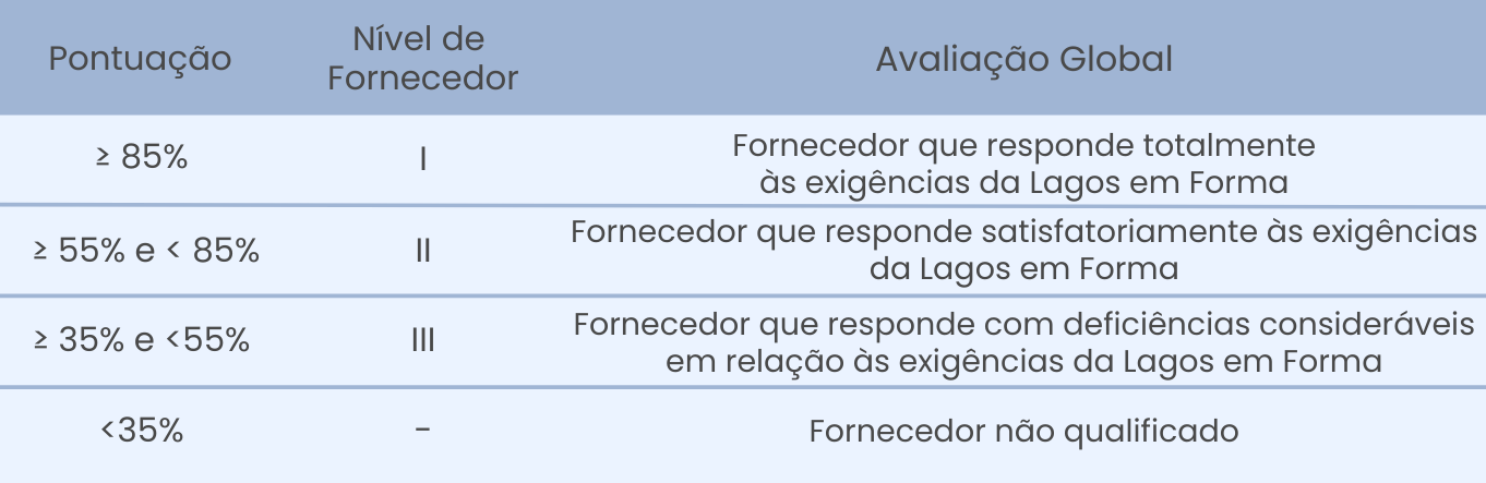 Neste sentido, os fornecedores da LAGOS-EM-FORMA, Gestão Desportiva, E.M. SA são avaliados com base nos seguintes critérios: